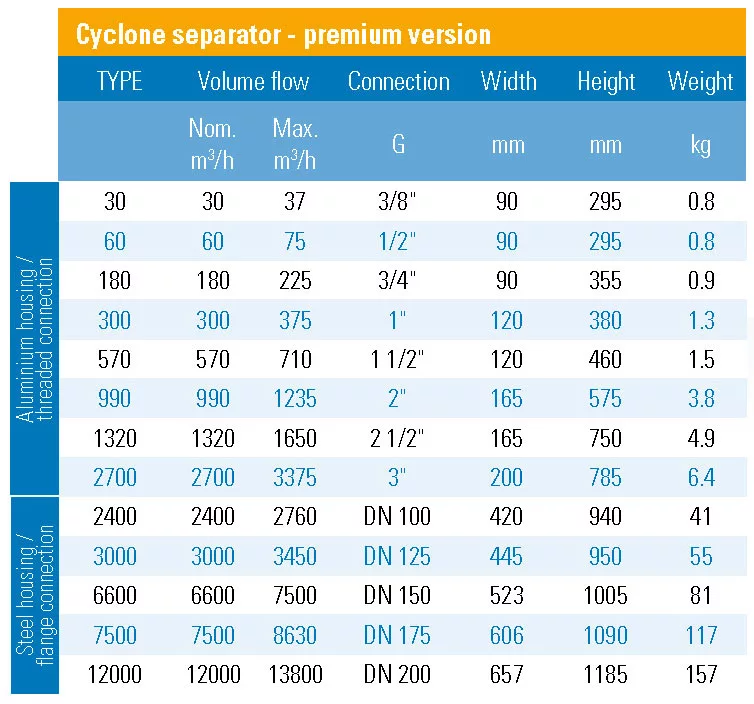 All data refer to 1 bar (abs), 20°C, 70 % r. h.Cyclone separator AS – Premium version